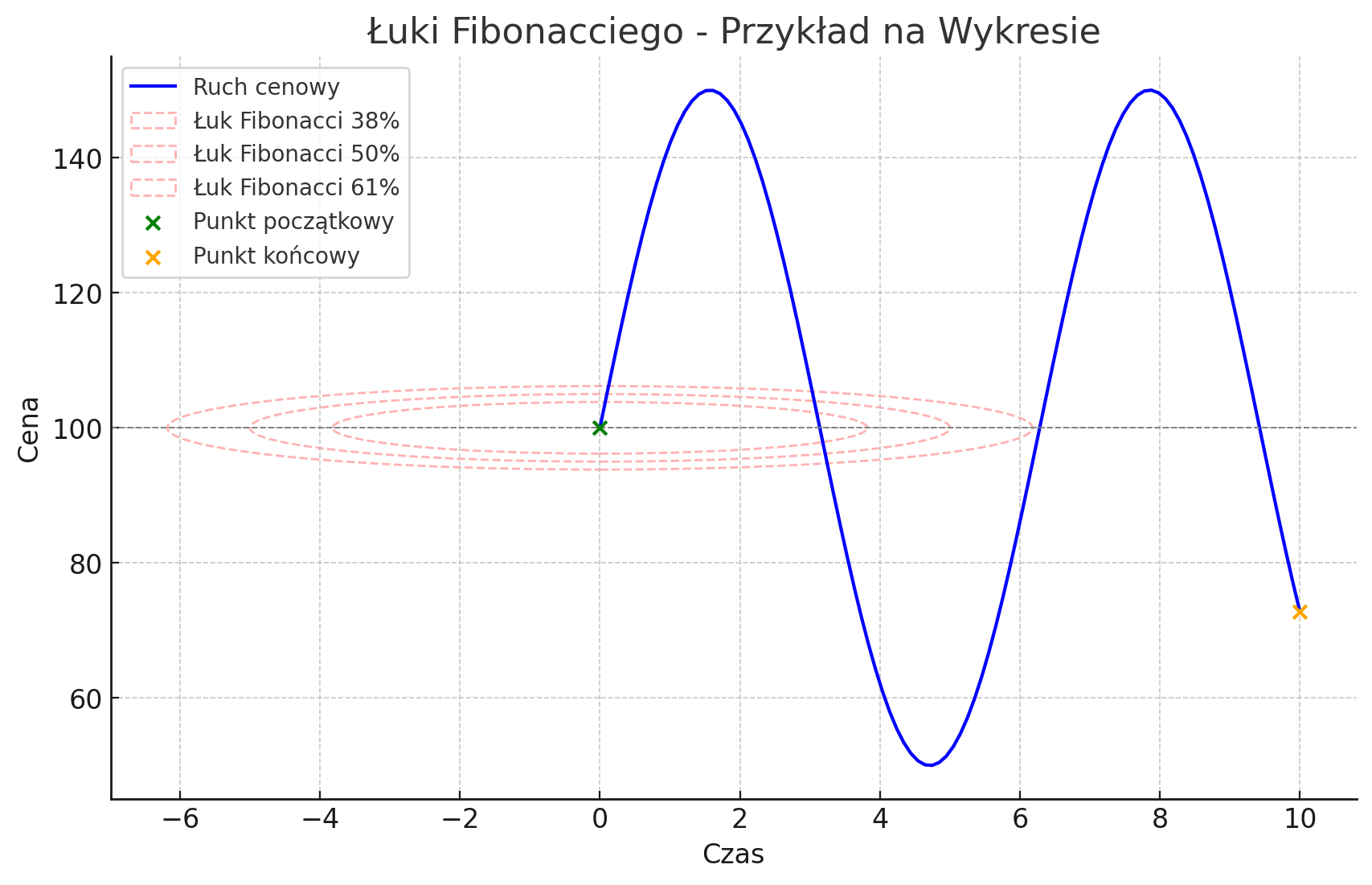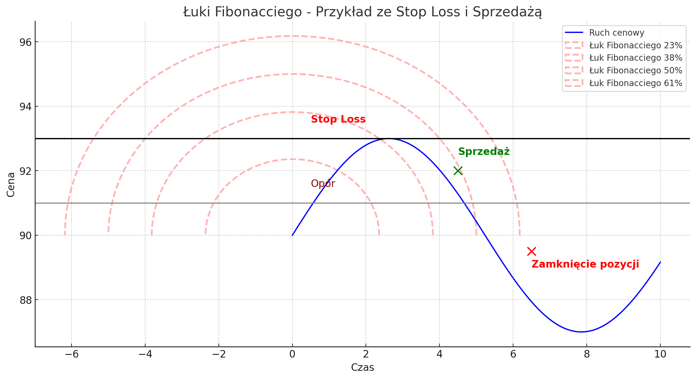 Załóżmy, że cena aktywa wzrosła od poziomu 100 do 150, a następnie zaczęła korygować. Narysowane łuki Fibonacciego od poziomu 100 (początkowego dołka) do 150 (szczytu) mogą pokazać, gdzie cena może znaleźć wsparcie – na przykład na poziomie łuku 38,2%, który może znajdować się w okolicach poziomu 130. Jeśli cena dotrze do tego poziomu i odbije się, może to być sygnał do otwarcia pozycji długiej. Tego rodzaju analiza jest szczególnie przydatna, gdy rynek znajduje się w fazie korekty, a inwestorzy szukają odpowiednich poziomów do wejścia w trend po atrakcyjniejszej cenie. Oprócz poziomu 38,2%, warto także obserwować inne kluczowe poziomy, takie jak 50% i 61,8%, które mogą pełnić podobną funkcję w zależności od dynamiki rynku. W przypadku głębszej korekty, łuk na poziomie 61,8% może okazać się kluczowy do oceny, czy trend nadal jest silny, czy zaczyna słabnąć.
